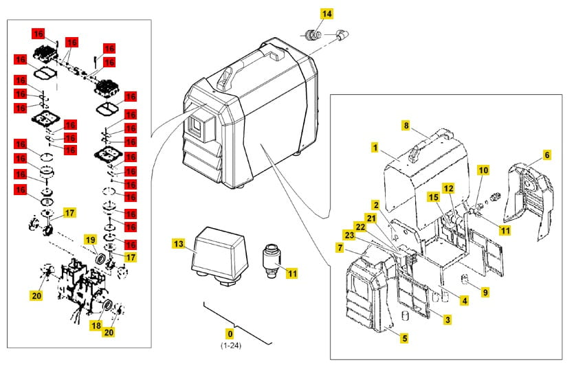 - Elementy wymienne niezbędne do przywrócenia pełnej sprawności sprężarki